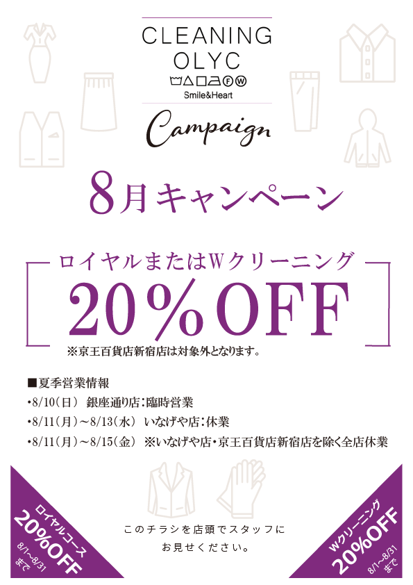 大切なお洋服に、ワンランク上の仕上がりを。ご好評につき、8月も「ロイヤルコース または Wクリーニング」が 20%OFF になるキャンペーンを実施いたします。