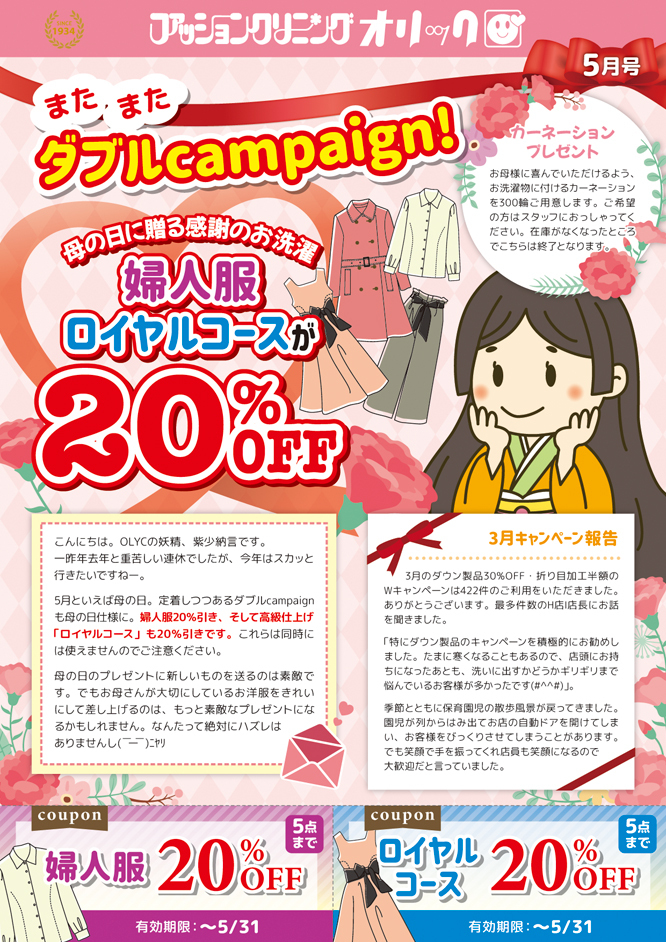 一昨年去年と重苦しい連休でしたが、今年はスカッと行きたいですねー。5月といえば母の日。定着しつつあるダブルcampaignも母の日仕様に。婦人服20%引き、そして高級仕上げ「ロイヤルコース」も20%引きです。これらは同時には使えませんのでご注意ください。母の日のプレゼントに新しいものを送るのは素敵です。でもお母さんが大切にしているお洋服をきれいにして差し上げるのは、もっと素敵なプレゼントになるかもしれません。なんたって絶対にハズレはありませんし( ̄ー ̄)ニヤリ// 別稿