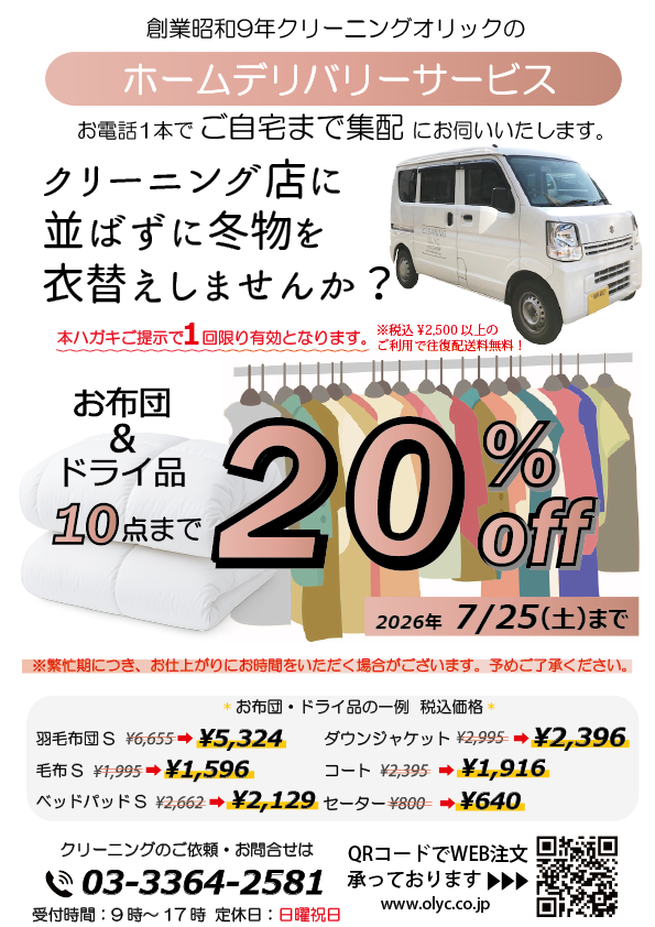 お洋服だけでなく、お布団や毛布もまとめてお得にきれいにするチャンスです。 ぜひこの機会に、便利なホームデリバリー(自宅集配)サービスをご利用ください。