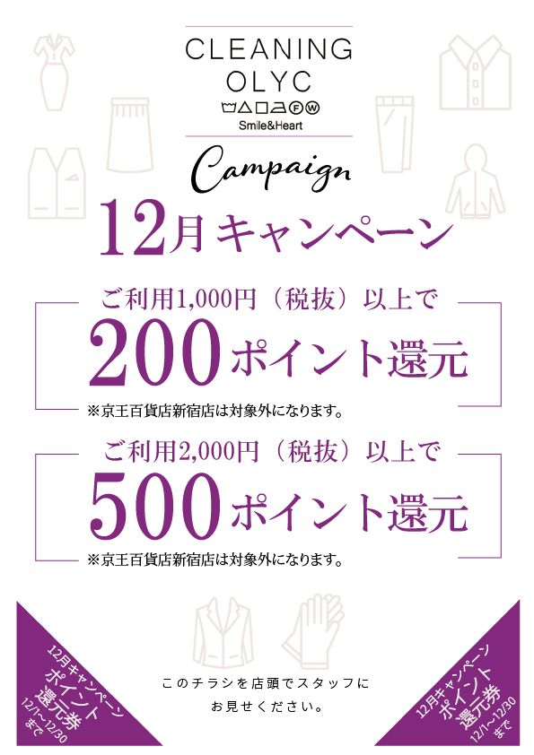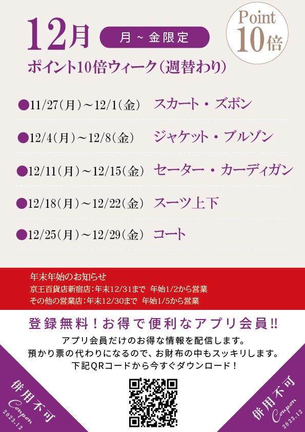 早いもので2023年もあっという間に師走でございます。今月はご好評いただいているポイント還元キャンペーンです。また12月は週替わりでポイント10倍サービスを実施します。下記に記載されている週替わり期間に対象アイテムをお出しになるとポイントが10倍付与されます。大変お得なサービスですのでまずは下記のQRコードからアプリを今すぐダウンロード!お預かり票の代わりにもなるのでお財布もすっきり。もちろん登録無料です。みなさまのご来店心よりお待ちしております。