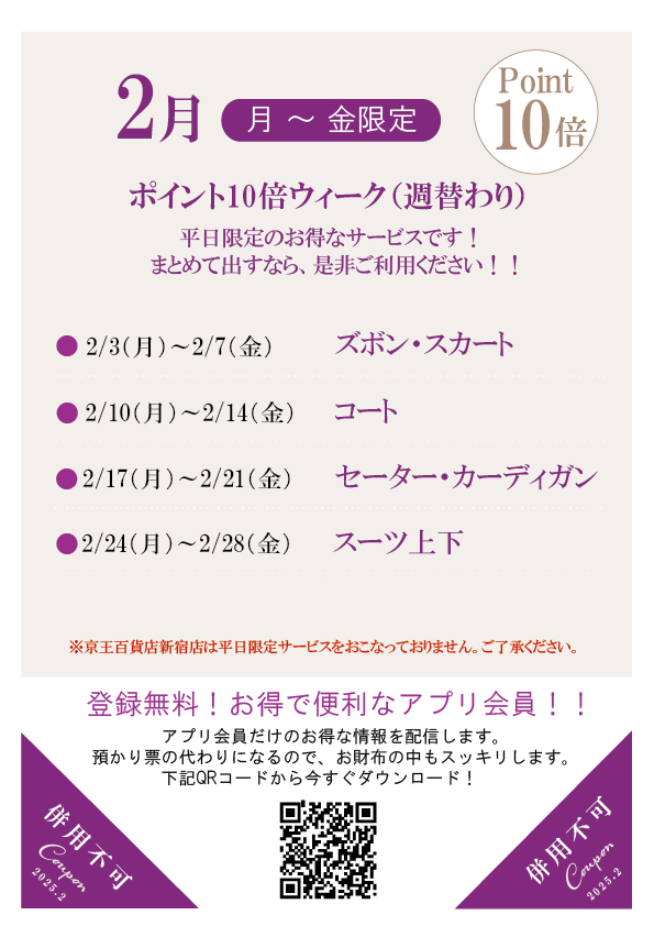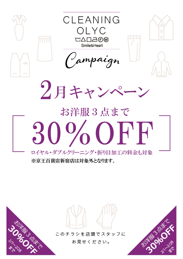 早いものでもう2月!大寒は過ぎましたが、まだまだ底冷えする日が続きますね。ご来店の際はくれぐれも暖かくしてお越しください。今月はお洋服が3点まで30%OFFです。ロイヤルコース・Wクリーニングも対象です。中でもスラックスの綺麗なセンターラインを永くキープ出来る、折り目加工は大変お薦めです。別名プリーツ加工。特殊な加工を職人が1点1点、丁寧に心を込めて施します。ぜひこの機会にご利用ください。